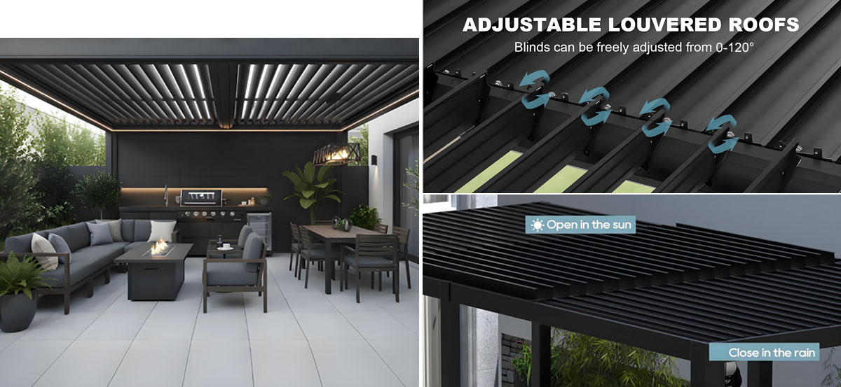 Break through the disadvantages of traditional shading, adopt intelligent control, and control the indoor temperature as you like. The louvered roof can be opened and closed according to the weather such as wind, rain and heavy snow.