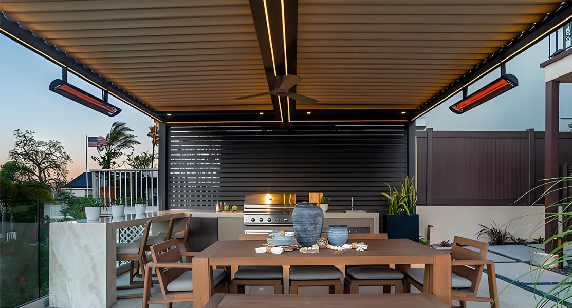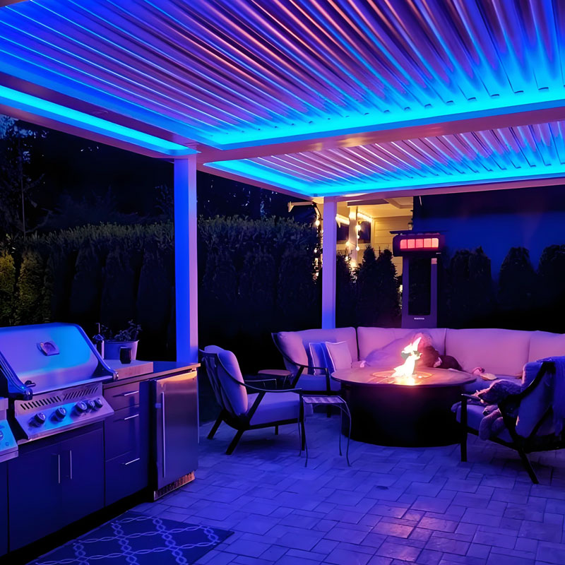 The LED lights are custom-designed for the AMS pergola and can be easily installed louver blade recesses or beam groove systems, creating an ideal atmosphere year-round.